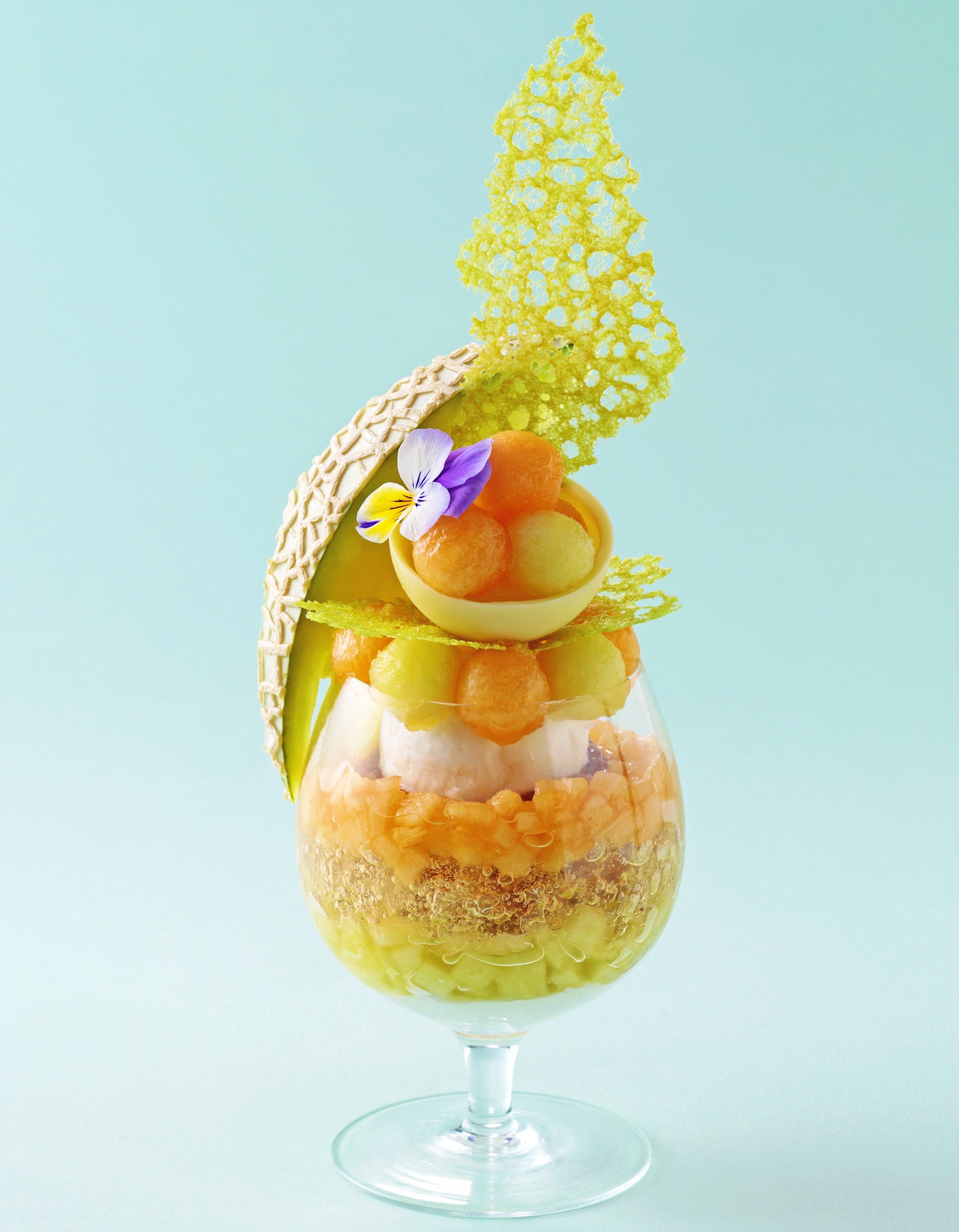 トップにそびえ立つパリパリとした食感が楽しい、ほんのりソルティな味わいのチュイールは、メロンの網目模様をイメージ。レモン風味のホワイトチョコレートカップの中には、赤肉・青肉2種類の色鮮やかな果肉を丸くくり抜いたジューシーなメロンボールが入っています。また、食べ進めるごとに溶け出すクリームチーズアイスは、パフェにコクのある味わいと酸味を添えます。