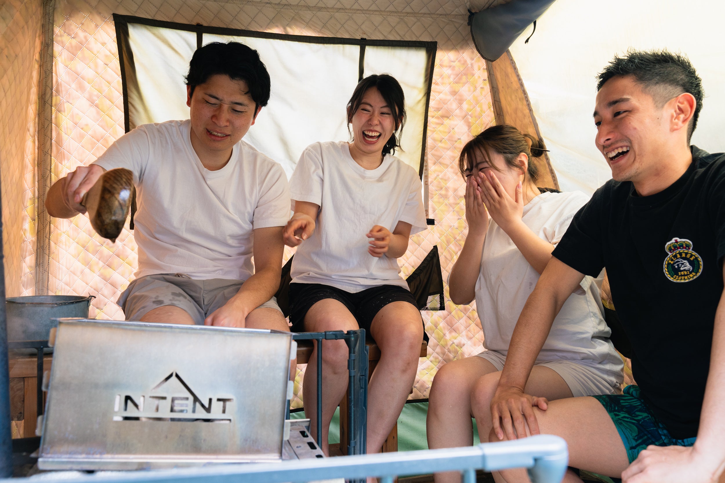 テント内の温度は最大100℃近くまで上昇し、自分でサウナストーンに水をかけるセルフロウリュウをしながら、お好みの温度、湿度で楽しめます。