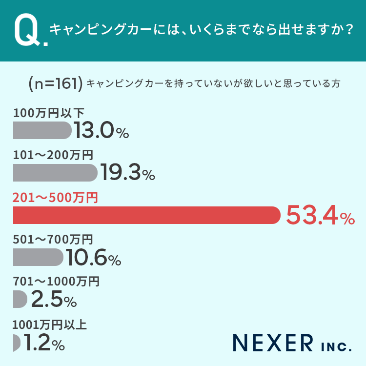 最後に「キャンピングカーを持っている」もしくは「持っていないが欲しいと思っている」と回答した方に、キャンピングカーに出せる金額を聞いてみました。