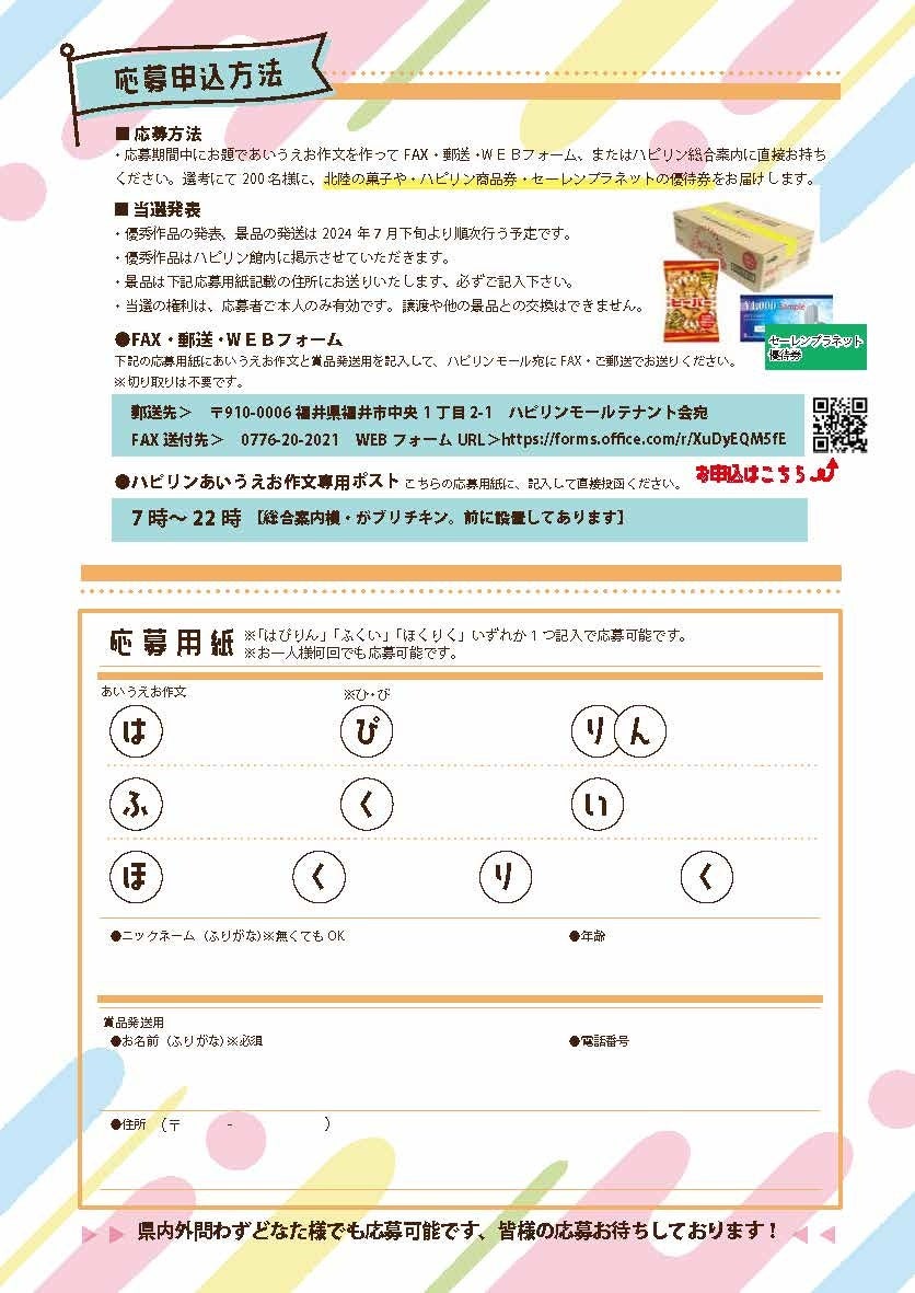 専用チラシにて郵送にて応募(郵送先:福井県福井市中央1-2-1 ハピリン管理事務所)