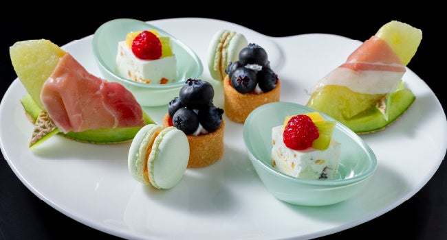 下段は、シチリアの伝統的なスイーツ”カッサータ”、塩気と甘さのコンビネーション”生ハムメロン”、”ブルーベリータルト”、”マカロン”などをご用意。