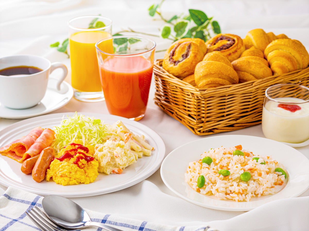 お腹いっぱいになれる朝食ビュッフェと広々とした駐車場を完備