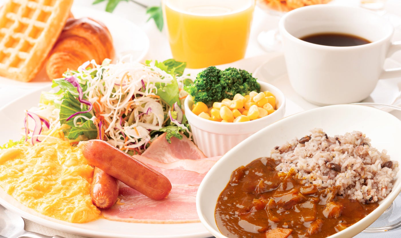 朝食は「Fun Every Morning「お腹いっぱい」モーニング」をコンセプトに、毎日食べても飽きずに楽しめるボリュームあるメニューをお届けします。アメリカのロードサイドをイメージした焼きたてワッフルや手軽にエネルギーをチャージできるカレーなどに加え、パンやサラダ、日替わりおかずなど朝から元気になれるメニューをお楽しみいただけます。さらに、コンフォートホテルの無料朝食ビュッフェで展開している季節のスムージーも日替わりにて提供します。