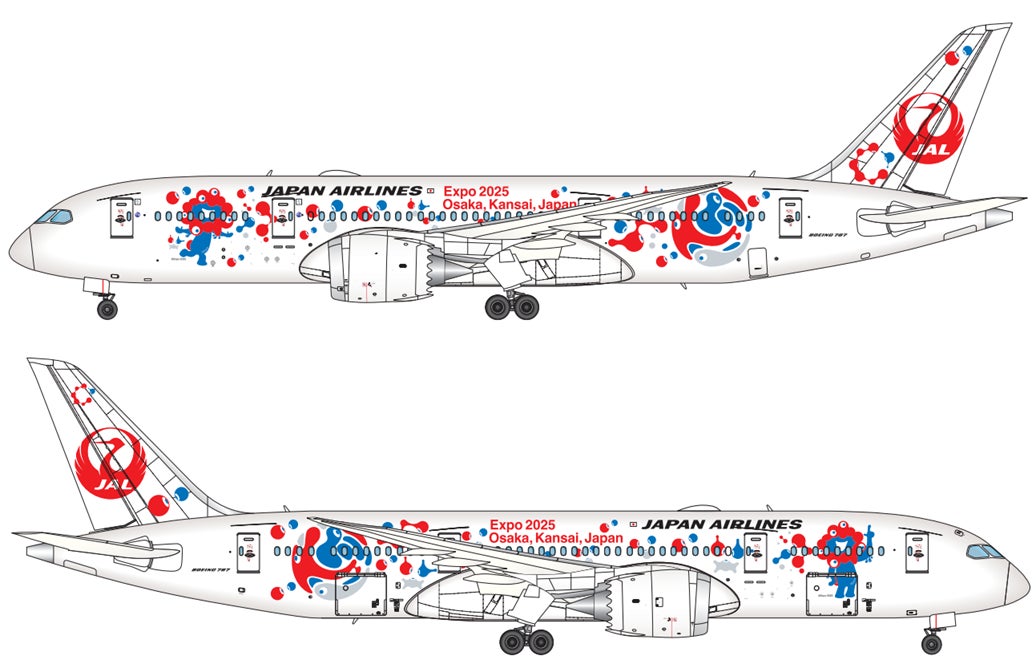 JALは、2025年4月13日から10月13日まで184日間にわたって大阪の夢洲(ゆめしま)にて開催される2025年日本国際博覧会(大阪・関西万博)の開催を記念し、J-AIR機材での第1弾に続き、このたび第2弾として国際線機材(ボーイング787-8型機)に公式キャラクター「ミャクミャク」など大阪・関西万博のオリジナルデザインの特別塗装を施し、6月3日より運航開始する予定です。
