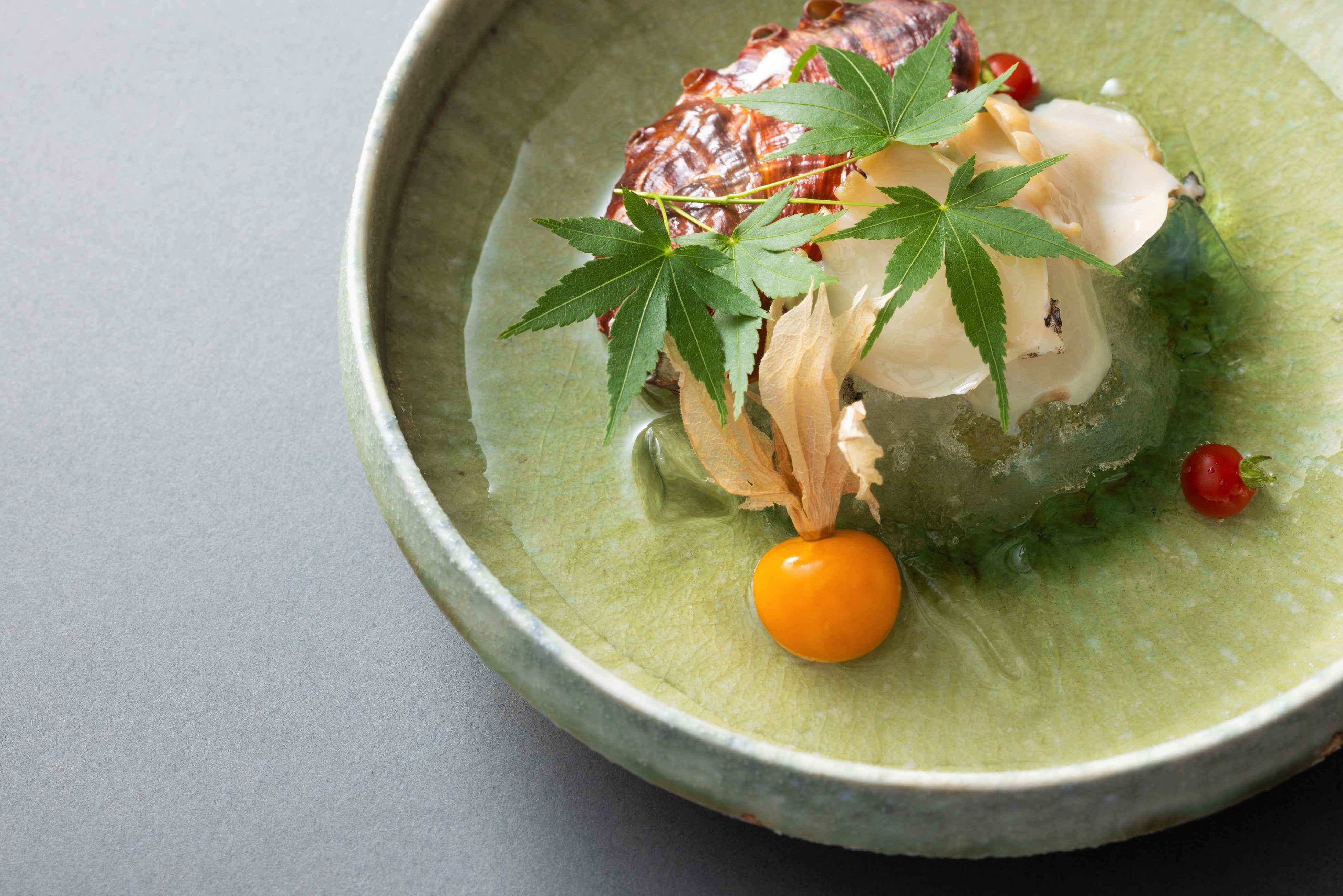 旬の鮑は、江戸時代、小諸城主にも献上されたという古文書をもとに、美食家・北大路魯山人が好んだとされる「鮑の水貝」に仕立てました。信州の天然水に浮かぶ鮑の刺身を山椒ソースで堪能いただく、信州の夏の涼を感じる一品です。身の引き締まった繊細な鮑の歯ごたえをお楽しみいただけるよう、お客さまの目の前で塩水を注ぎご提供いたします。
