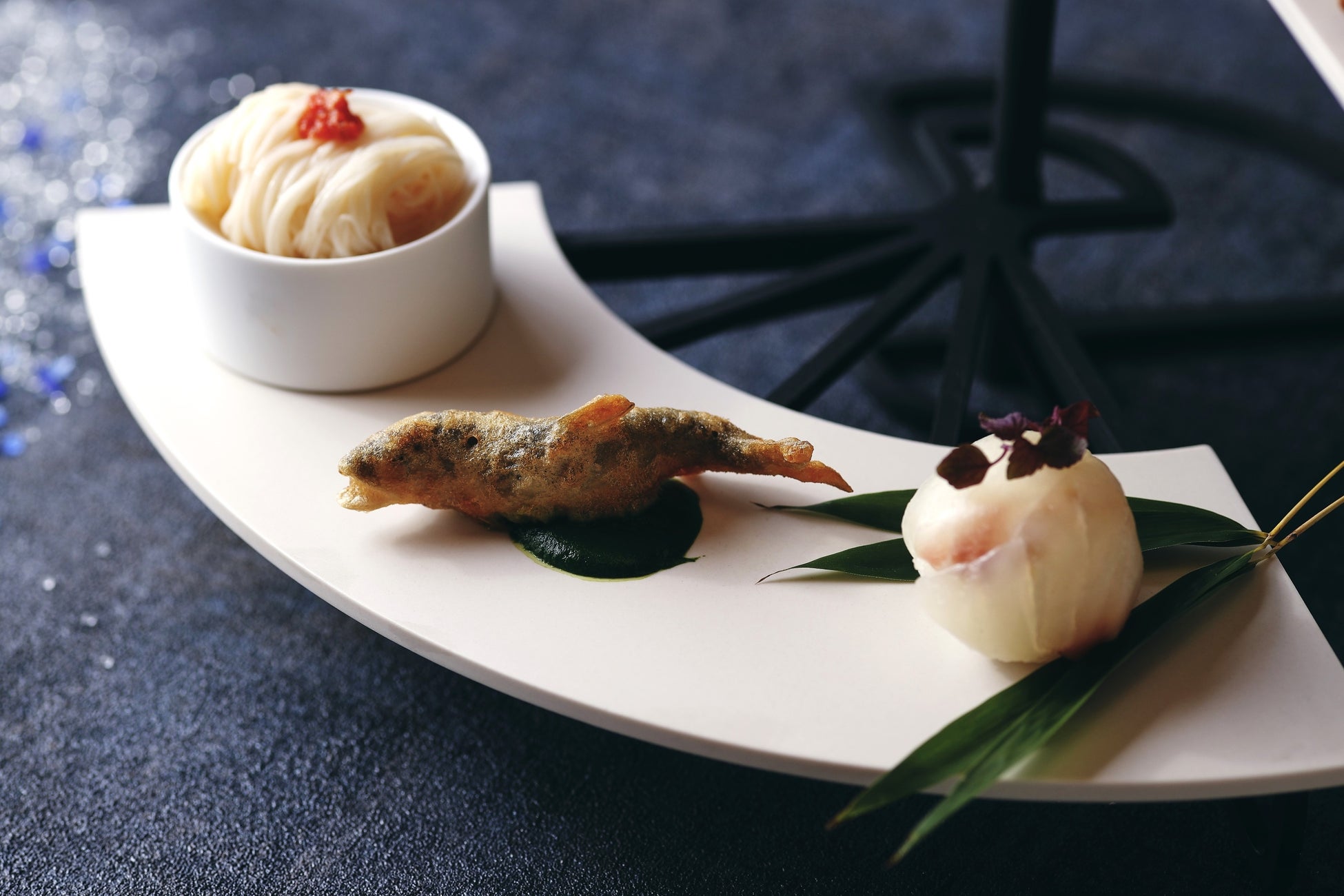 七夕飾りのちょうちんをイメージした「パッションココ・バナーヌ」は、ココナッツムースの中にパイナップルソテーやバナナクリーム、パッションクリームを忍ばせ、夏の訪れを感じる一品です。ずっしりとしたフロマージュに柔らかな甘みのライチムース、白桃コンポートを重ねた「白桃とライチのガトー」には、風に揺られる短冊のようなチョコレート飾りをあしらいました。スイーツには毎回和の要素を取り入れており、今回は、栗羊羹、抹茶羊羹を抹茶のビスキュイに重ねた「抹茶ほのか」や、青く透き通る寒天と、なめらかな舌触りのこしあんを2層に仕上げ、七夕の夜空をイメージした「天の川(錦玉)」をご用意しました。スイーツを引き立てるセイボリーは、手毬寿司、そうめん、稚鮎などを洋風にアレンジしたこだわりの3品をお愉しみいただきます。