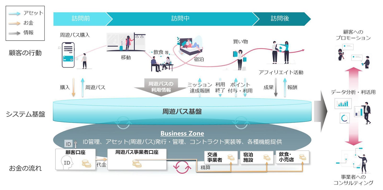 本検証では、定額料金で電車やバスなどが乗り放題になる観光周遊パスをトークンで実装し、DCJPYのスマートコントラクト(*1)による複雑な事務処理(例:交通機関や店舗に対する利用状況に応じた精算や、利用者に対する未使用分のポイントバック、紹介者に対する報酬の付与等)の自動化に関する検証を行いました。