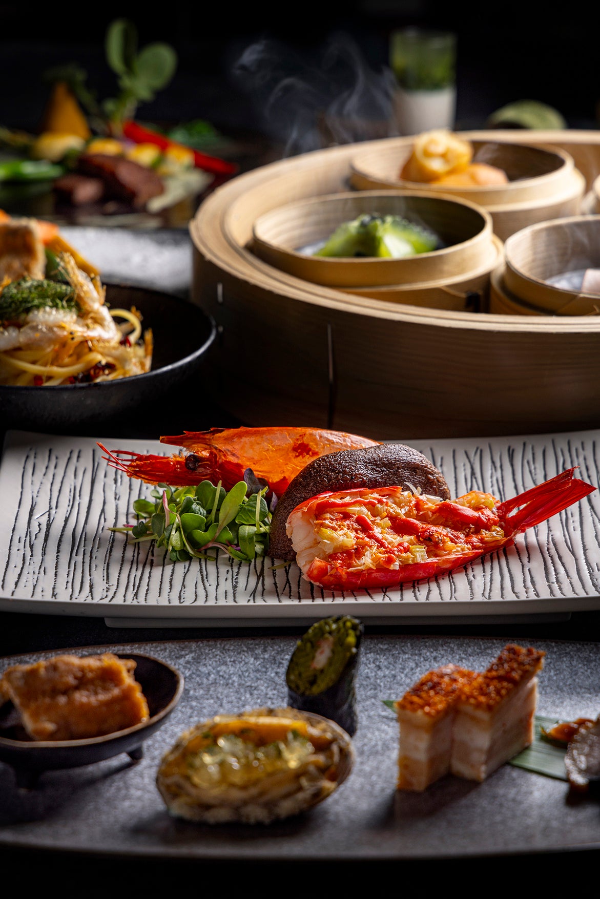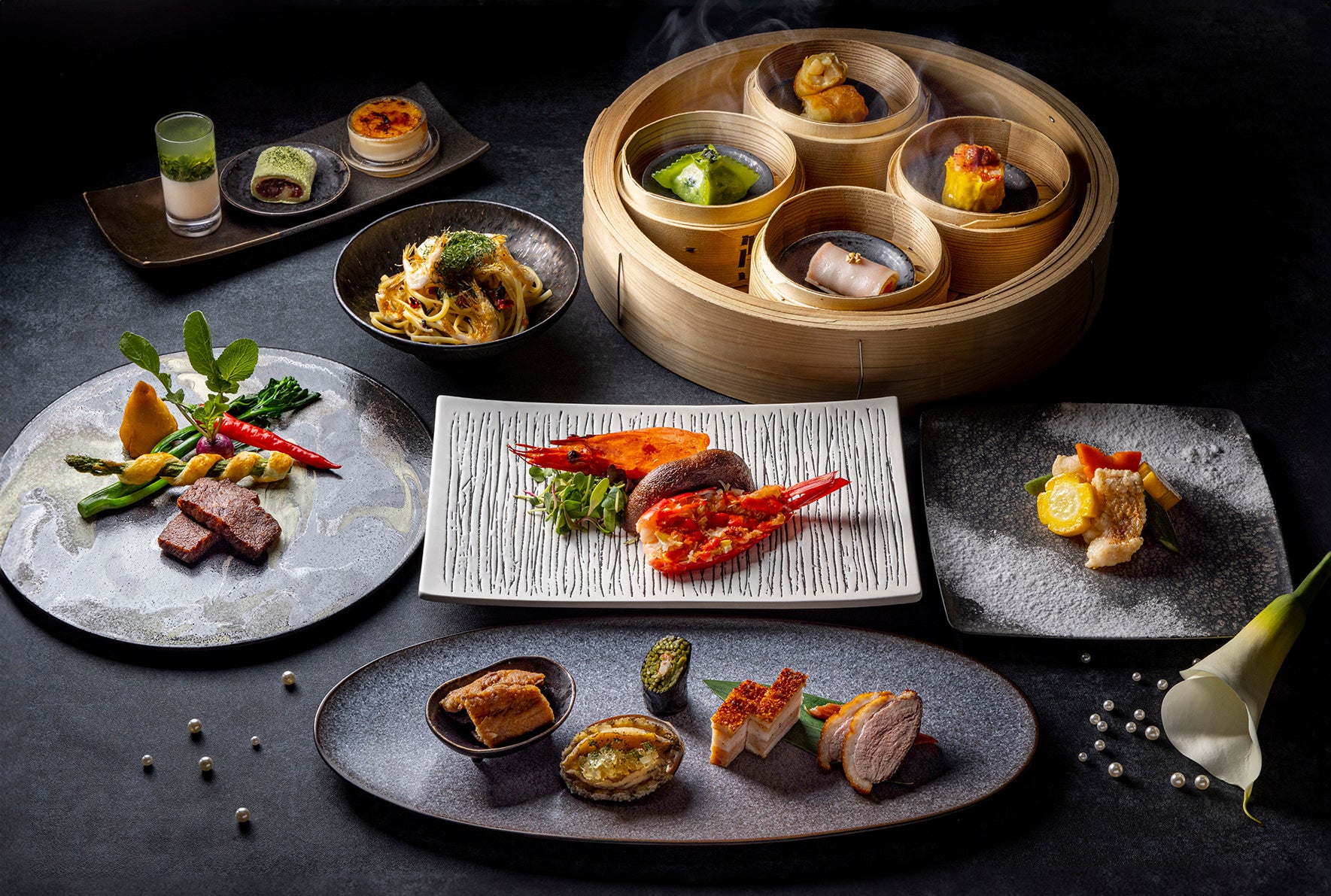 日本各地から厳選した旬の食材をつかったランチ・ディナーコースが、夏に向けてメニューチェンジ。信州サーモンや信州ポークを使用した飲茶、白エビを紀州南高梅と大葉、塩昆布とともに生パスタのリングイネに合わせ、中国料理にイタリアンや日本料理の技法をとりいれたユニークなメニューもご堪能いただけます。東京のパノラマを一望する美しい眺望とともに、クリエイティブな感性が光る美食の世界をお愉しみください。