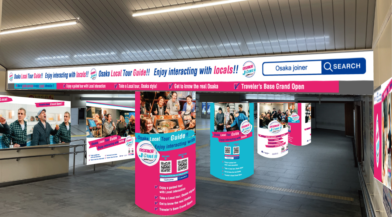 今回、「Osaka JOINER」のインバウンド向けプロモーションの一環として、Osaka Metroなんば駅と南海なんば駅をつなぐ地下連絡通路一帯で、内外壁面、丸柱などを活用し、「Osaka JOINER」のビジュアルで埋め尽くすジャック広告を実施します。このエリアは、訪日旅行者が多く訪れる大阪・難波における主な動線であると同時に、国内外多くの人々が行き交う活気に満ちたスポットです。OOHの強みであるインパクトある空間ジャック広告を通じて、一般に事業立ち上がりに時間を要すると言われるインバウンドサービス(「Osaka JOINER」)の加速を図ります。