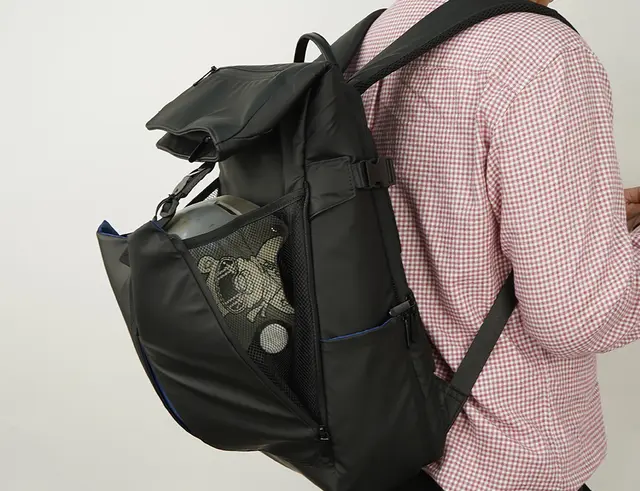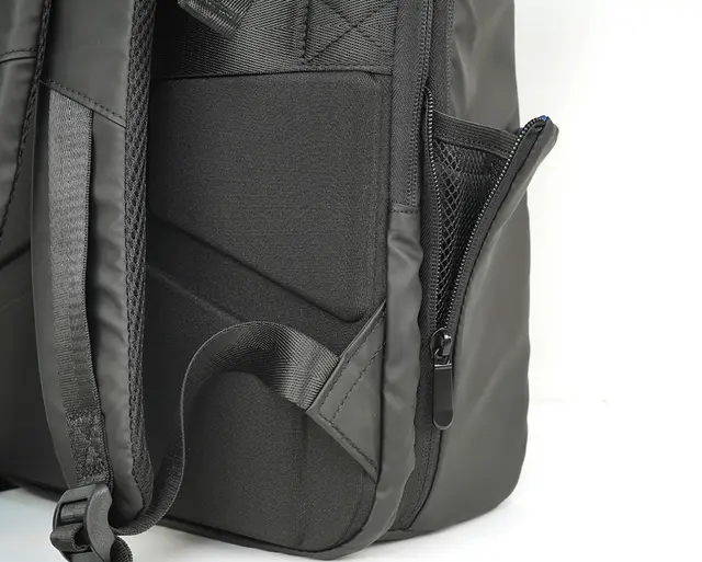 外見は、高級感があり落ち着いたマットレザーのリュックに見えます。「表面が傷つきやすい、耐久性が低い、手入れが複雑」などの懸念があるかもしれませんが、コーティングされたナイロン素材は意外なほど耐久性があり、スポーツ中の傷や摩擦に強いのが特徴です。またお手入れも簡単で、表面が汚れた場合は湿った布やティッシュで拭くだけで済みます。