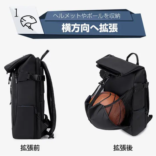 ヘルメット、バスケットボール、サッカーボール、ジャケット、ラケットなど大きな物、長い物を拡張して収納できます。