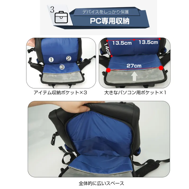 ※バックパック内のジッパー部分は防水ではありません。予めご了承下さい。