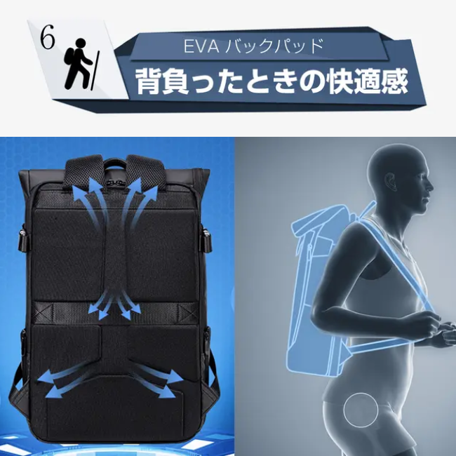 人間工学に基づいた背中の構造:弾性とクッション性に優れた EVA バックパッド+エアガイドグルーブ