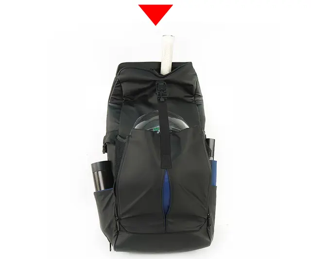 横の拡張は外側の大きなネット式拡張で、ボールやヘルメットのような大きいものを収納。縦の拡張はロールトップ式に拡張でテニスやバドミントンのラケットのような長いものを収納できます。