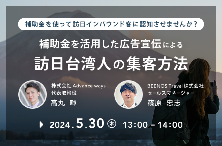 2024年4月の訪日外客数は2019年同月の4%増の約304万人に達し、2か月連続で300万人を突破しました。台湾からの訪日客は2024年1月~4月の累計で約193万人にのぼり、韓国についで2位の訪日客数を記録しています。BEENOS Travelは訪日台湾人観光客の集客に取り組む国内の宿泊施設向けに無料ウェビナー「補助金を活用した広告宣伝による訪日台湾人の集客方法。」を開催いたします。