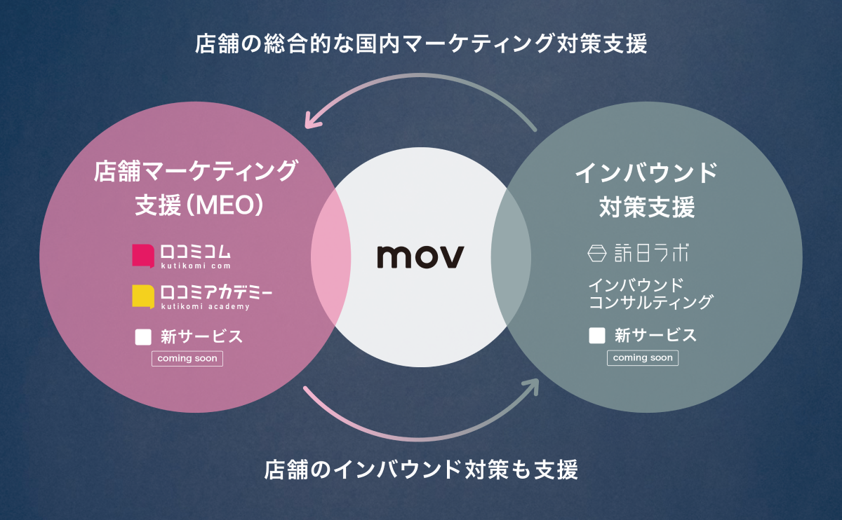 movでは、インバウンド支援事業として業界最大級のインバウンドビジネスメディア「訪日ラボ」を運営し、店舗支援事業としてAI店舗支援SaaSの「口コミコム」を展開しています。