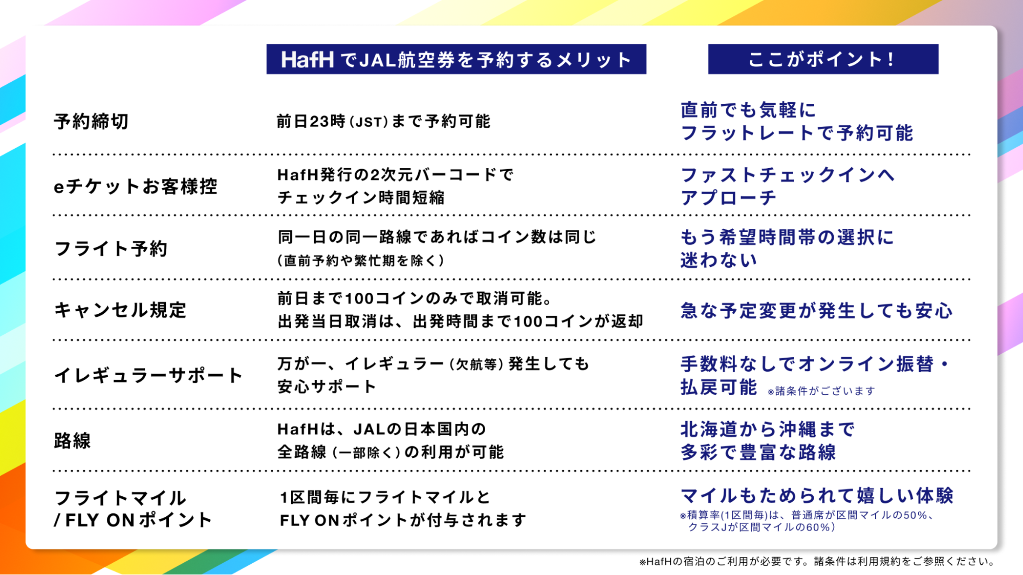 ・対象期間中に、HafHでJAL航空券を予約 / 搭乗された方で、搭乗対象期間中の初回の航空券予約について、50%のHafHコインが還元されます