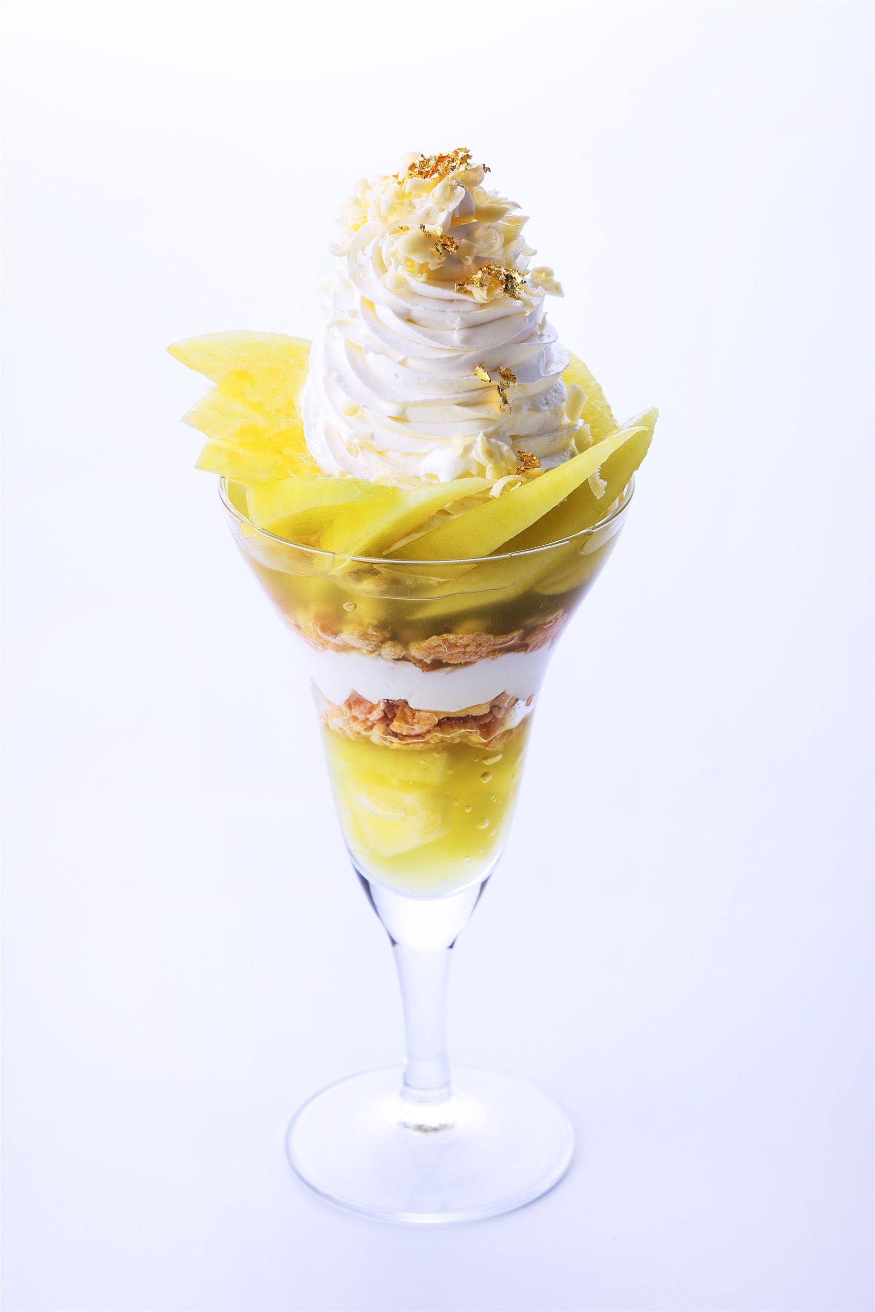 マスクメロンを使用したジュレと自家製の口当たり軽やかなマスカルポーネクリームを交互に重ねた層の上に、マスクメロンを贅沢に並べ、ホテルメイドのなめらかで濃厚なソフトクリームを乗せました。ソフトクリームの上には金箔とホワイトショコラをあしらい、上品で華やかに。ジューシーなマスクメロンを芸術作品のように盛り付け、美しいパフェに仕上げました。