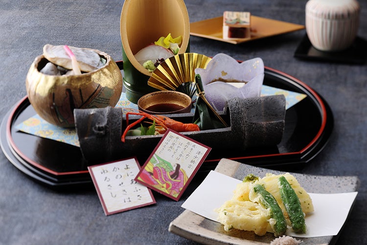 百人一首の中でも海や水をテーマにした句の多い夏の歌をイメージし、涼しげで、緑や青を意識したメニューに仕上げました。前菜は、「もずく酢」や「絹湯葉豆腐」、「笹巻麩」などの涼やかな味わいと、「枝豆」、「若桃蜜煮」など、爽やかな緑の食材を盛り込みました。焼き物には、夏に旬を迎える太刀魚を味噌漬けで。青さの香りが海を感じさせる「烏賊の磯部揚げ」は、夏野菜とともにさっぱり藻塩でお楽しみください。