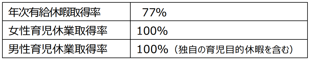 「イクボス育成による働きやすい職場づくりの推進」、「育児休業取得促進」、「年次有給休暇の取得促進」等の取り組みにより、仕事と家庭の両立の支援を行っています。