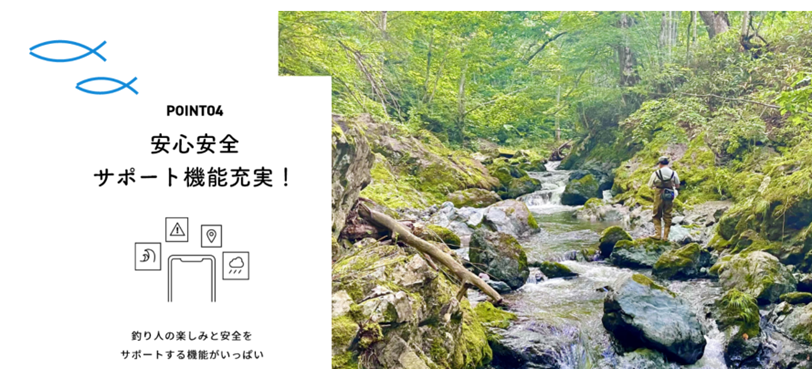 また、GPS機能を活用した安全確認システムや、川のゾーニングによる釣り禁止・C&R区画の通知機能、釣り場情報、川の増水などを知らせる防災通知情報などのたくさんの機能を備えており、釣り人の安全を守ります。