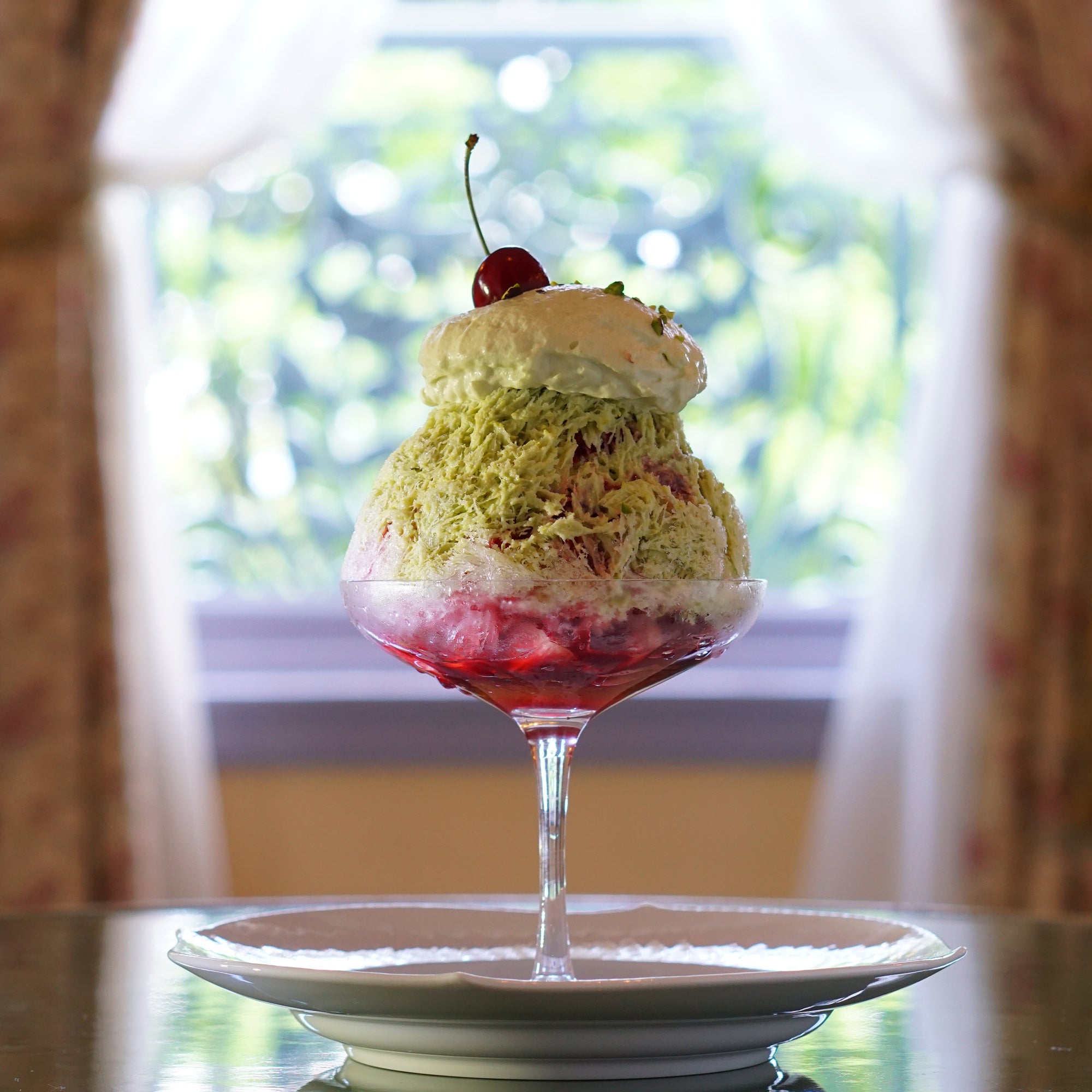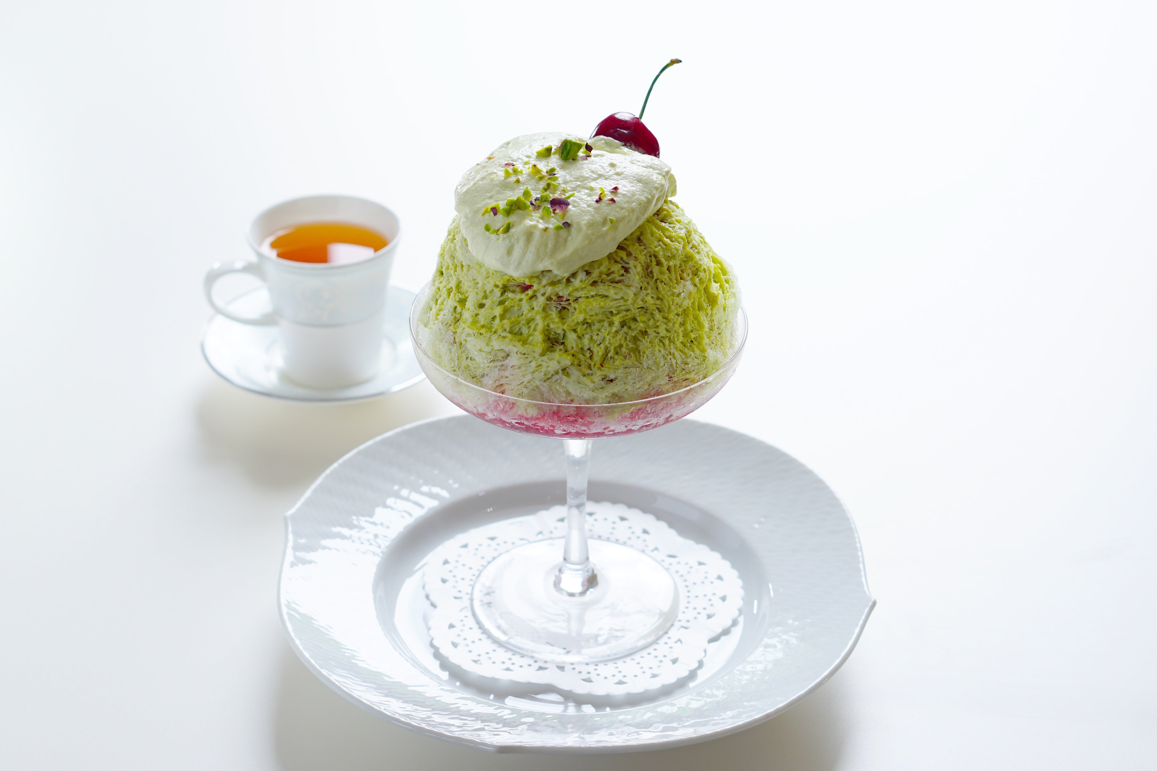 グラスの底にはオレンジリキュールのシロップを含んだブリオッシュ生地、フレッシュなアメリカンチェリー、ピスタチオのエスプーマクリーム。その上に、細かく削った氷・ピスタチオの濃厚な練乳ソース・甘酸っぱいグリオットチェリーソースをそれぞれ繰り返し重ねて仕上げました。