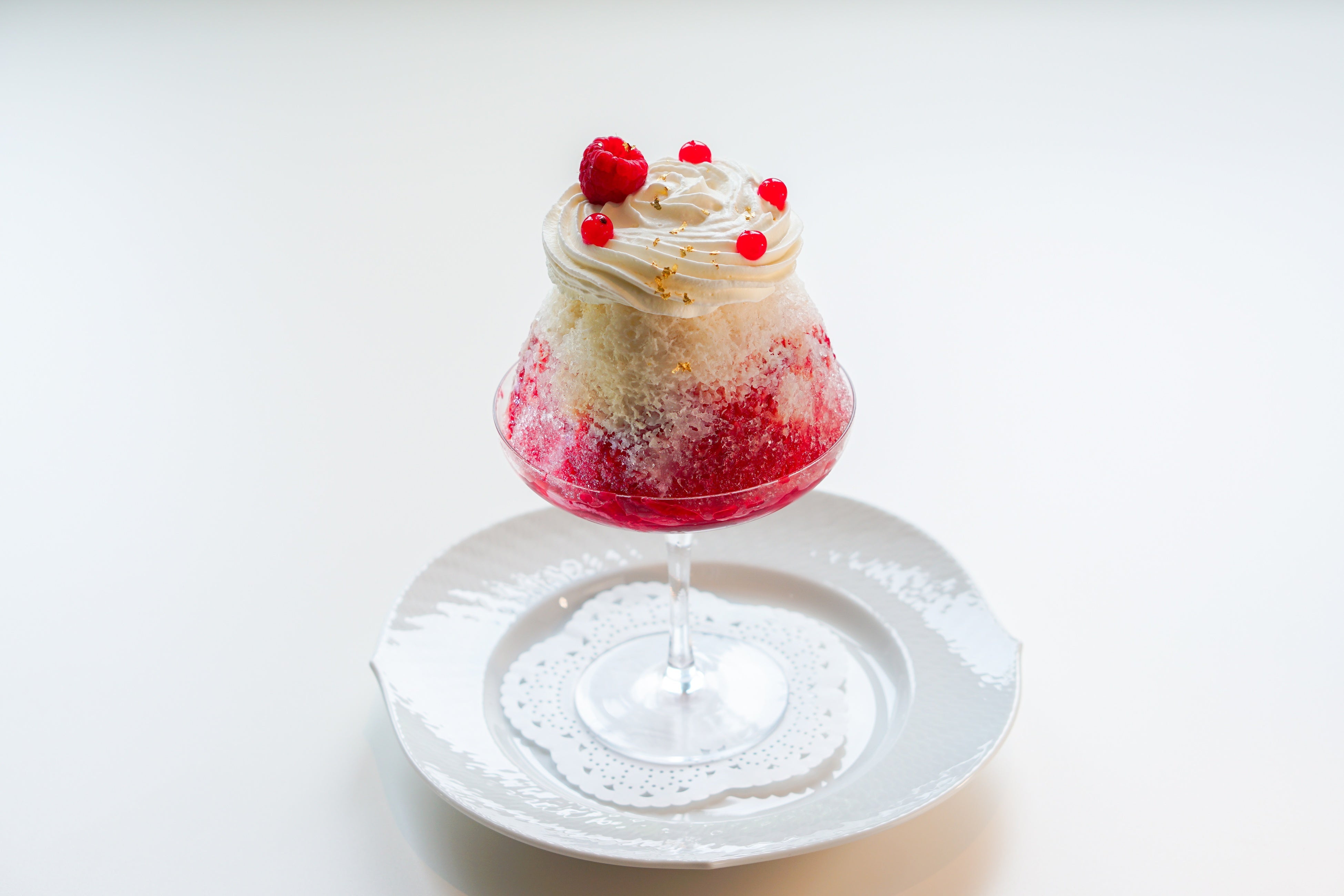長楽館氷菓は、日本の夏の風物詩「かき氷」と、ブリオッシュに洋酒入りシロップを染み込ませたフランス伝統菓子「サバラン」を組み合わせることで生まれた、味わいの変化を楽しんでいただくスイーツです。かき氷をデザートとして追求し、「最後の一口まで楽しめる」オリジナルスイーツを創りました。