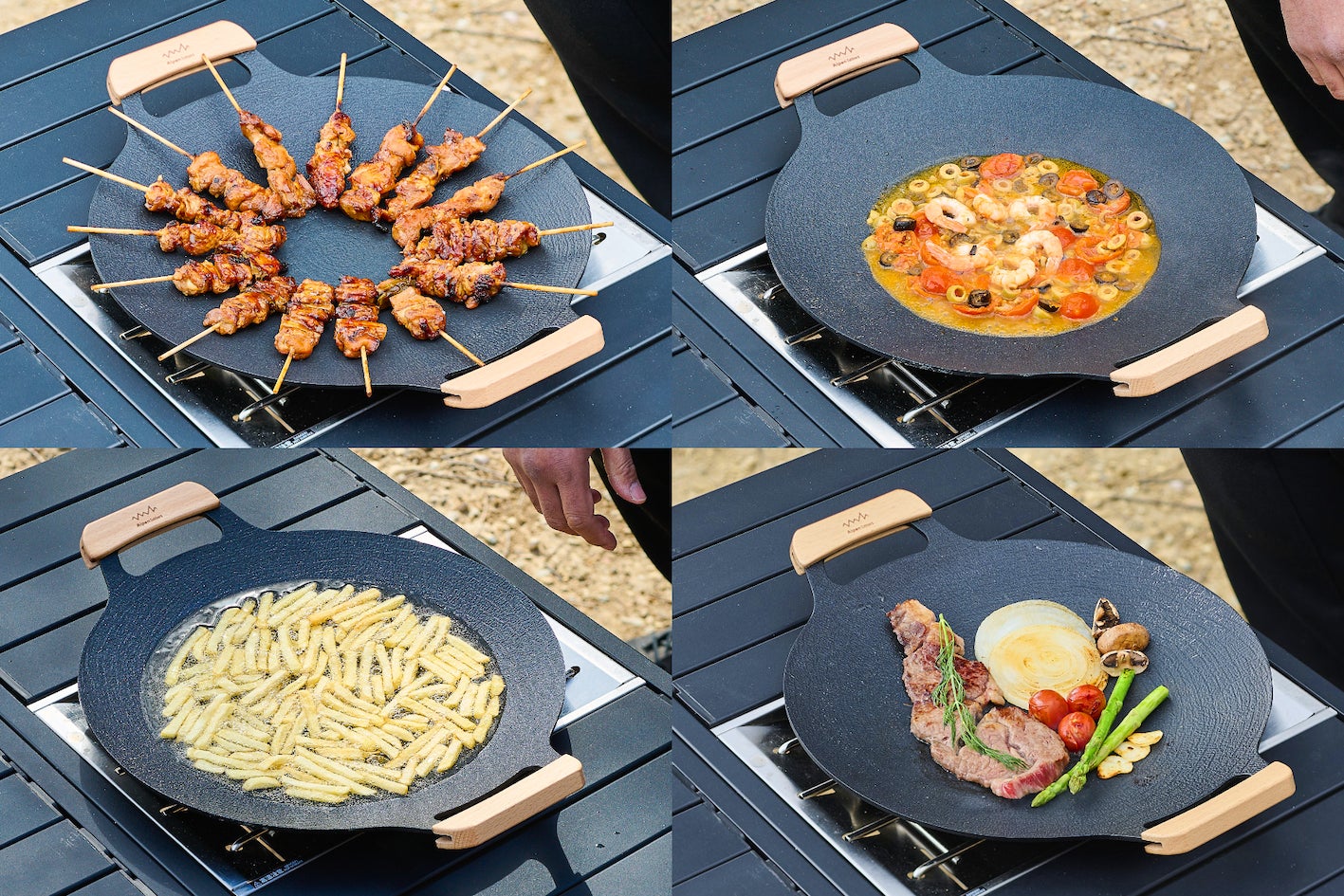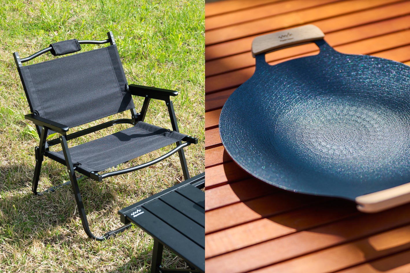 撥水加工生地と頑丈なアイアンフレームを備えた「撥水ローチェア」は、汚れに強く、高級感のあるデザインで快適な座り心地を提供、また、軽量で焦げ付きにくい「アルミグリドルパン」は、直火はもちろんIHにも対応し、幅広い料理が可能です。