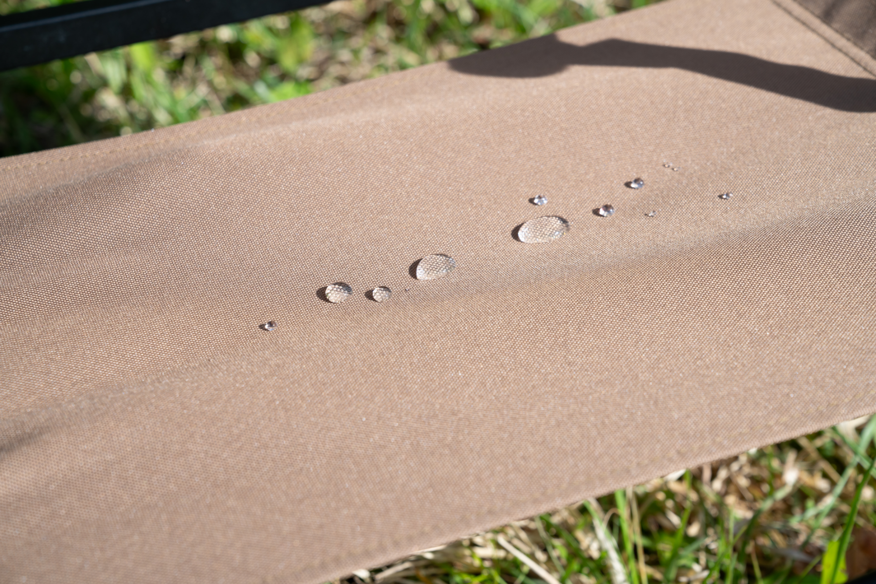 水や汚れに強い、撥水機能を施した生地を採用。キャンプシーンで飲み物をこぼしたり、突然の雨に見舞われたりしても、染み込むことなくサッと拭き取れ、楽にお手入れができます。シーンを問わず、汚れを気にせずに利用できる便利なローチェアです。