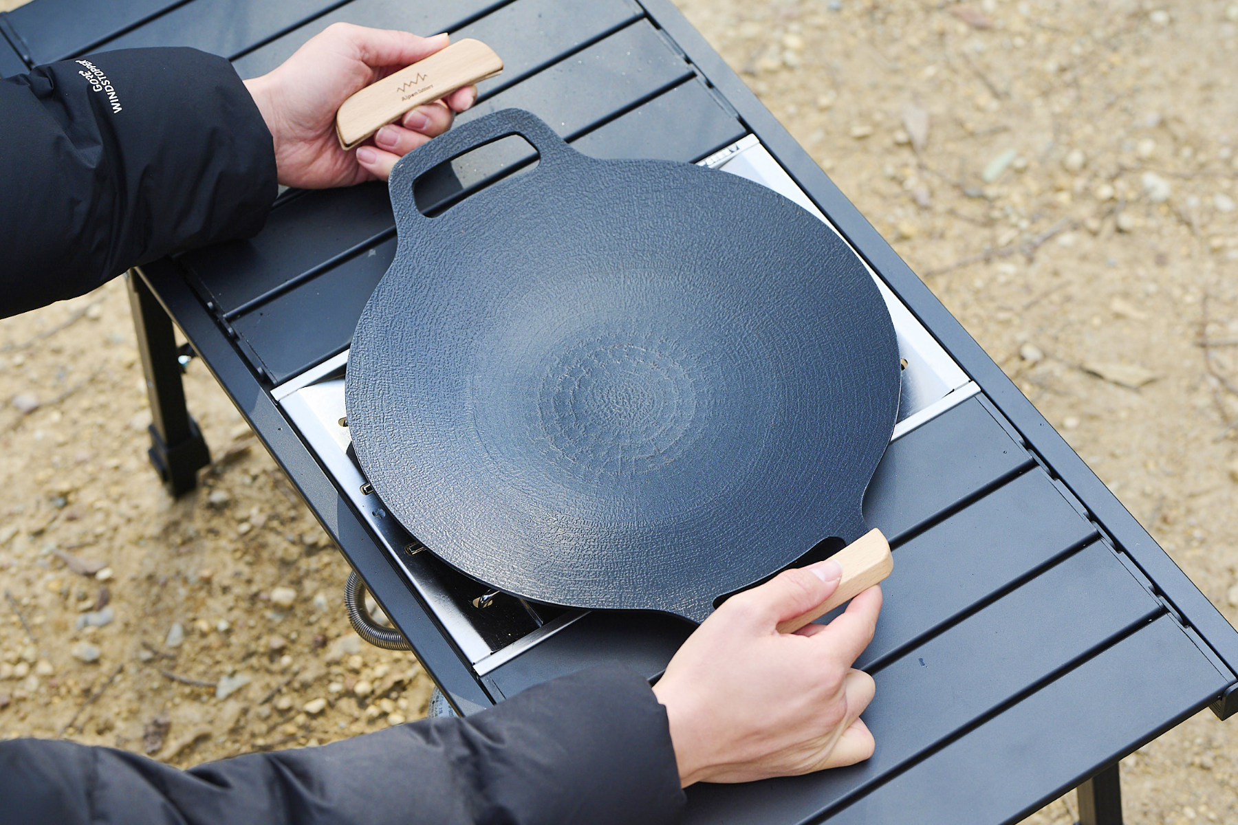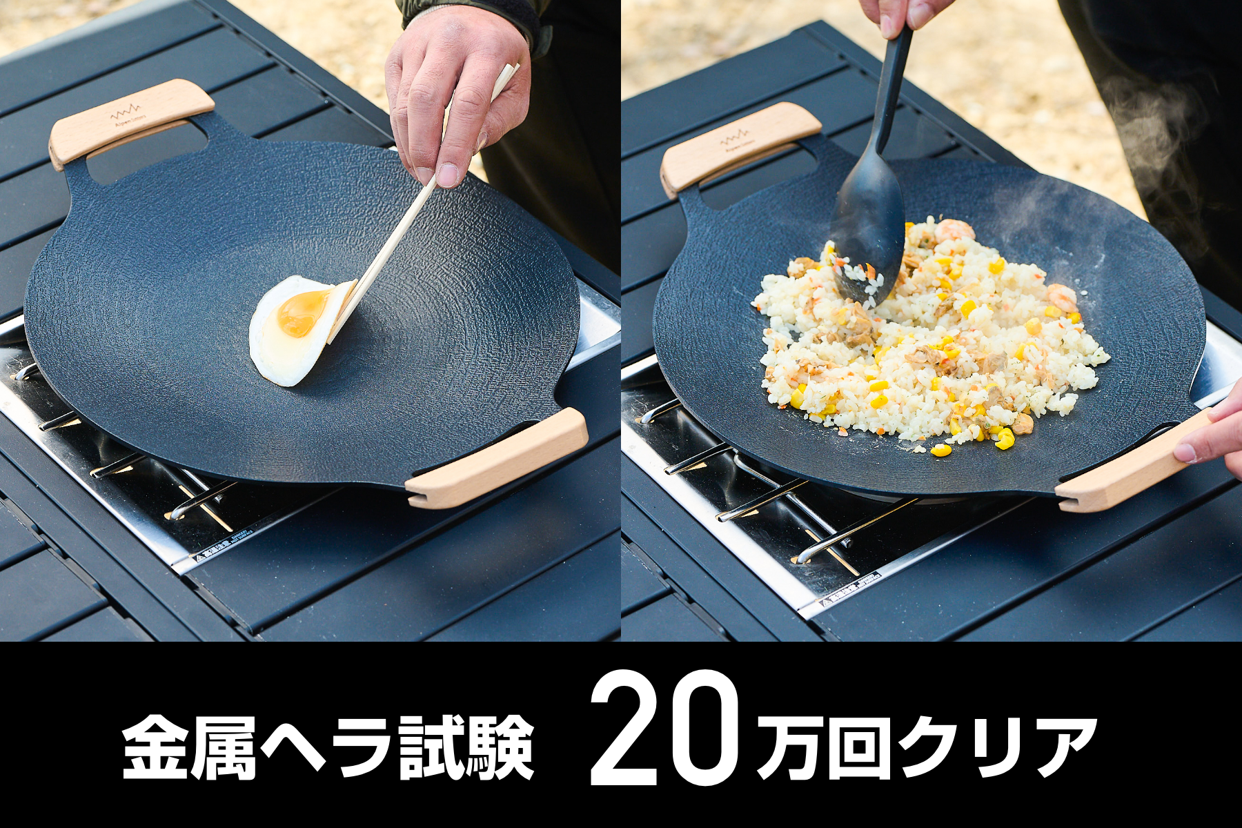 撥水加工生地と頑丈なアイアンフレームを備えた「撥水ローチェア」は、汚れに強く、高級感のあるデザインで快適な座り心地を提供、また、軽量で焦げ付きにくい「アルミグリドルパン」は、直火はもちろんIHにも対応し、幅広い料理が可能です。
