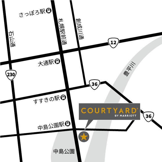 本ホテルは、最寄りの札幌市営地下鉄南北線「中島公園」駅から 徒歩3 分、JRに乗り継ぎも可能な「さっぽろ駅」までは地下鉄で約8分と北海道各地へのアクセスにも便利です。また、すすきのや大通など、札幌の中心部も徒歩圏内にあり、ショッピングや市内観光を楽しめます。冬には、周辺のホテル経由のバスに乗って、市内主要スキー場に行くこともできます。