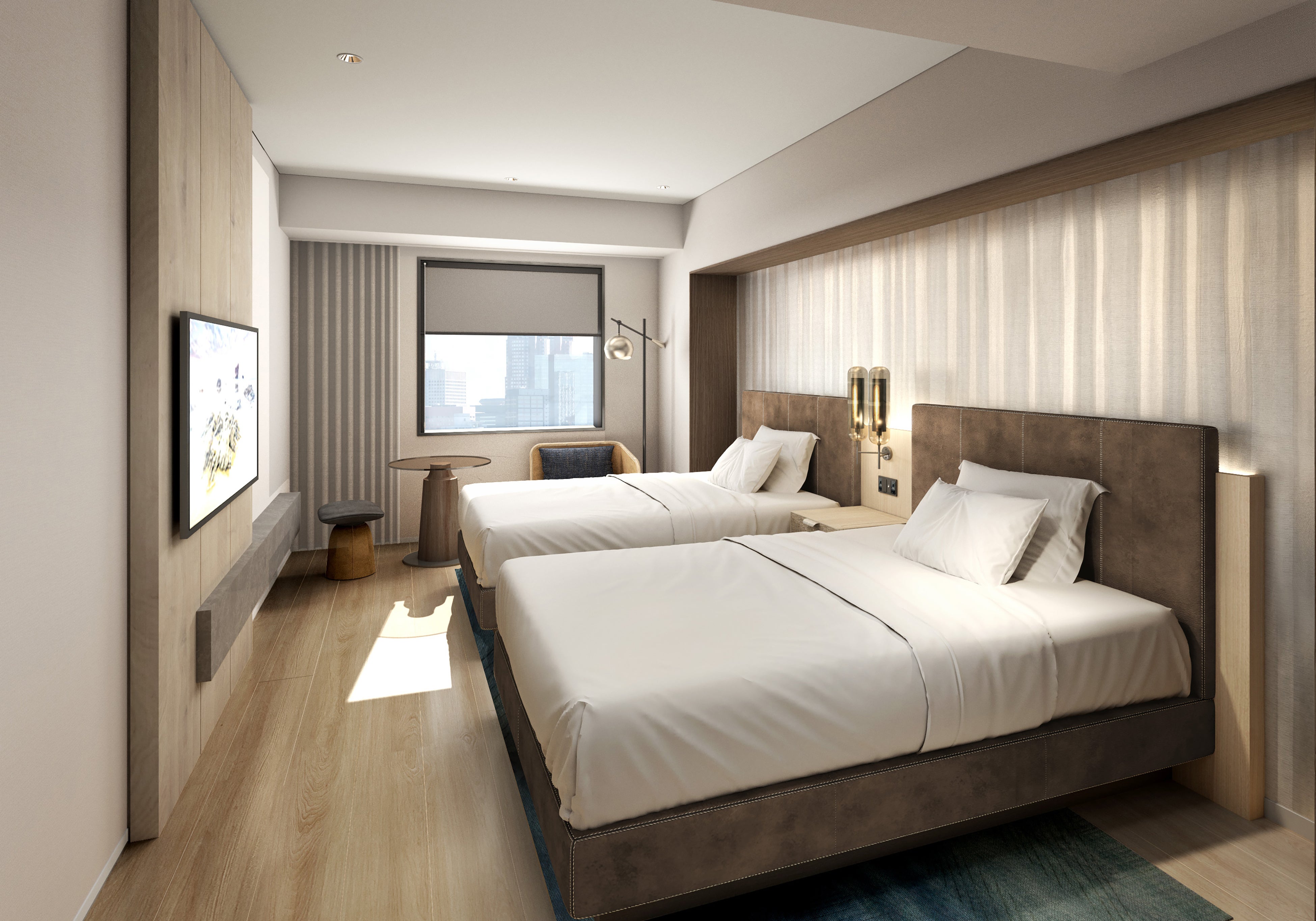 ゲストルームは 9 室のスイートを含む全 321 室。「キング」「ツイン」の両タイプを基本としつつ、お客様の多様な宿泊ニーズに対応するため、ソファベッド付の客室、ファミリーやグループでのご利用に便利なコネクティングルームもご用意しました。室内は自然の風合いをアクセントにしたデザインが施され、「コートヤード・バイ・マリオット」らしいスタイリッシュで心安らぐ空間となっています。無料 Wi-Fi サービスや USB ポートも備えており、仕事を快適に行えます。室内には上質なSertaのベッドマットレスやレインシャワーを備え、お部屋でのリラックスした時間を満喫できます。