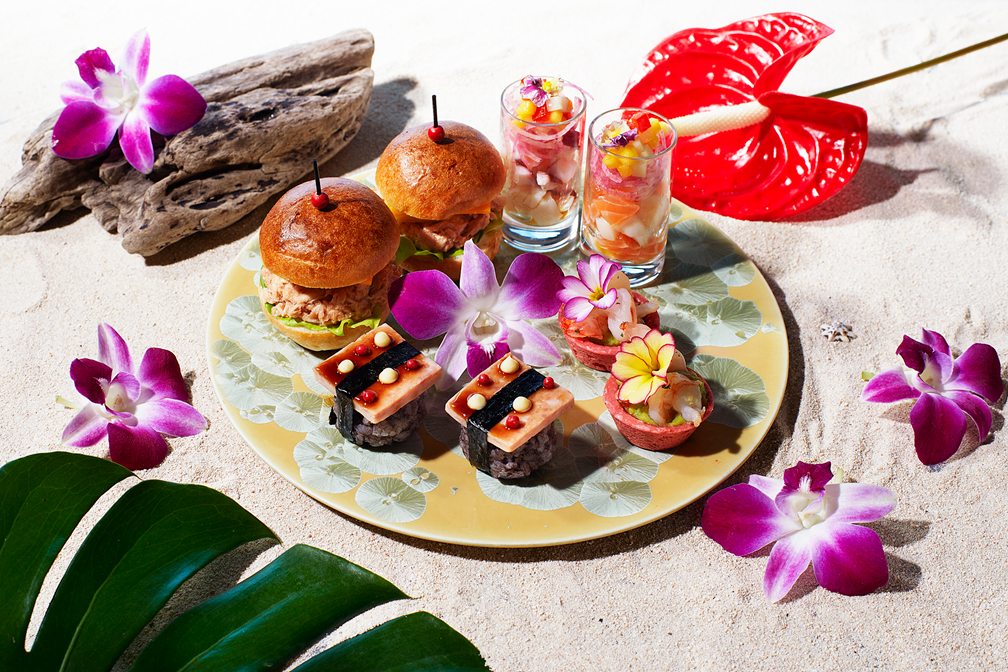 セイボリーにも夏らしく、元気が出るようなビビットな色合いのトロピカルなアイテムをラインアップしました。ほぐしたチキンにグリルしたパイナップルを合わせた「プルドチキンバーガー」は暑さを吹き飛ばし、夏バテに負けないことを期待した一品。ホタテ、タコ、サーモンと紅芯大根のサラダを合わせた「ポキとフルーツサルサ」は、フルーツサルサソースで味わう暑さの中でも清涼感を感じられるアイテムです。人気のエビとアボカドの組み合わせは「ガーリックシュリンプとアボカドディップ」に。南国ハワイを彷彿とさせるのは現地でも人気の「スパムライス」。美容効果もあると言われるアサイーを混ぜたごはんを軽く握り、照り焼きソースとマヨネーズを塗って、ピンクペッパーで仕上げています。