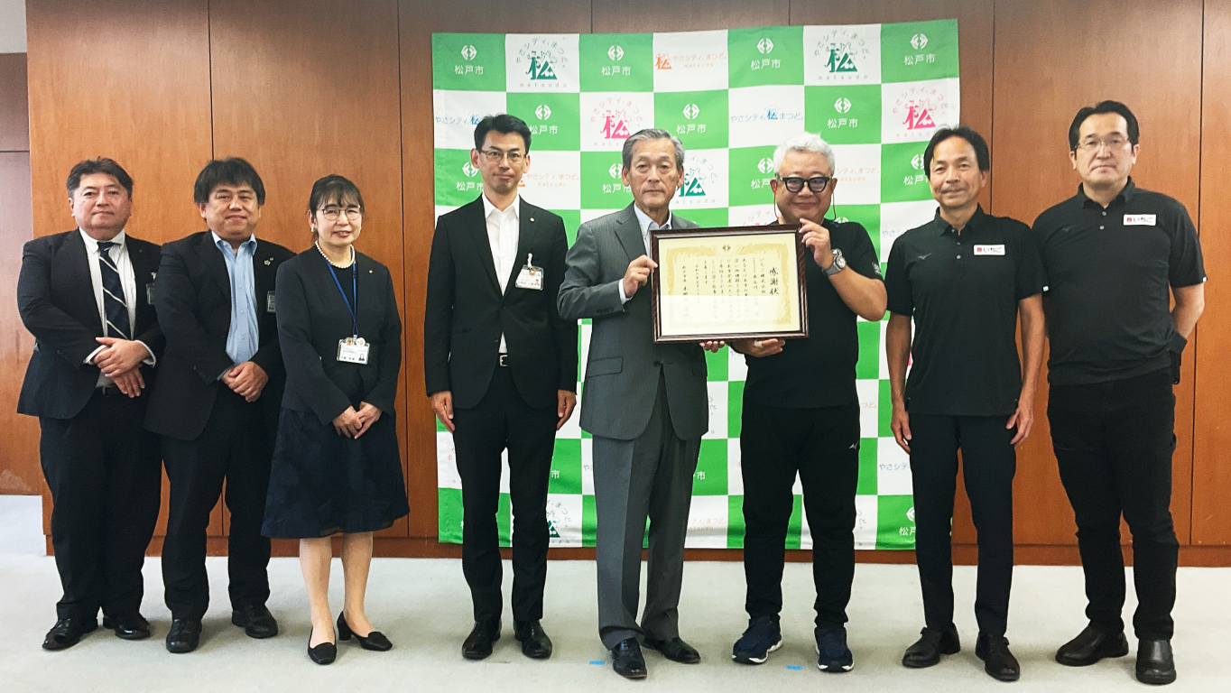 当社は、このたび、千葉県松戸市(本郷谷健次市長)の重点化事業「子育て・教育・文化を軸とした都市ブランドづくり」を支援するため、「3×3バスケットボールコートの整備」および「文化・芸術に係る事業の充実」に対して地方創生応援税制(企業版ふるさと納税)に関わる寄付を実施し、松戸市より感謝状を贈呈されました。