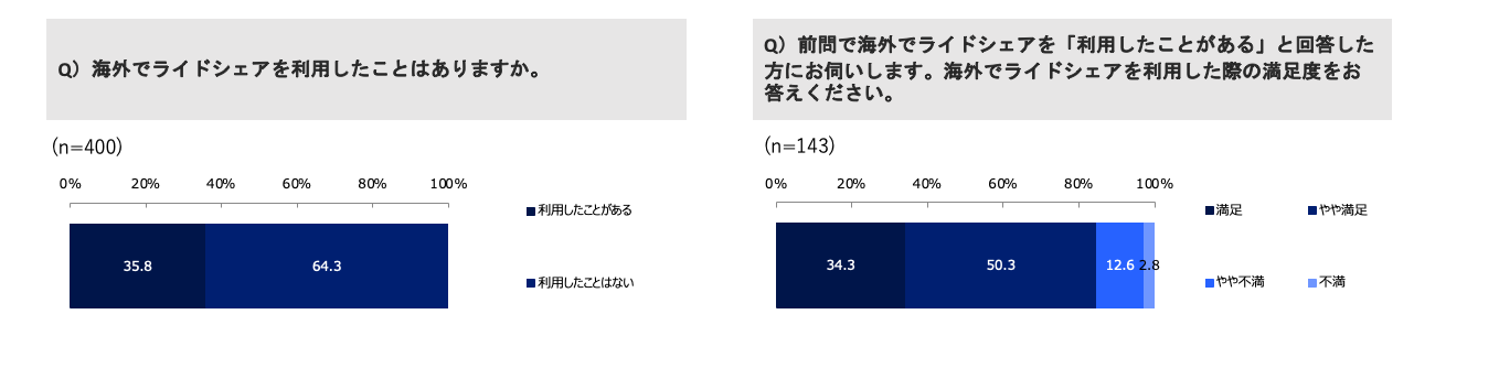 本調査対象の400人のうち3分の1以上(35.8%)が海外でライドシェアを利用した経験あり。利用経験者のうち、8割以上(84.6%)が利用におおむね満足(満足/やや満足)しており、特に「スムーズに乗車できた」「ドライバーが親切だった」点が高評価