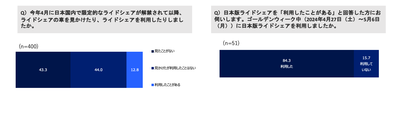 本調査対象の400人に国内でのライドシェアの利用経験について聞いたところ、「見たことがない」「見かけたが利用したことはない」が総計87.3%と、日本版ライドシェア(自家用車活用事業)の利用水準はまだ低い状況。また、一度利用したことがある人のうち84.3%がGW期間中に「利用した」と回答しており、リピート率が高い可能性がある。