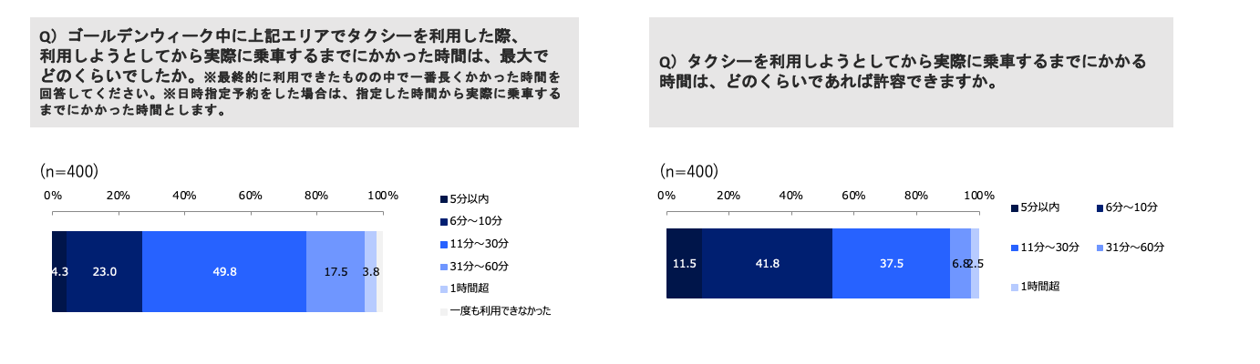 【設問】GW中に上記エリアでタクシーを利用した際、利用しようとしてから実際に乗車するまでにかかった時間は、最大でどのくらいでしたか(n=400)