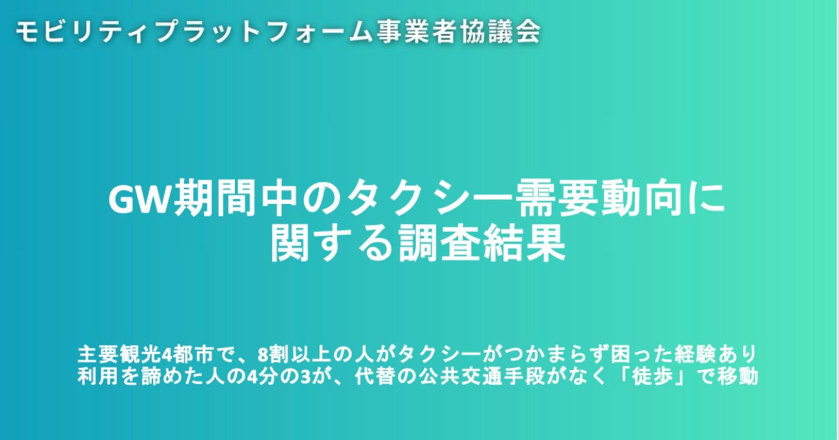 モビリティプラットフォーム事業者協議会(所在地:東京都千代田区、代表:石山アンジュ)と一般社団法人新経済連盟(所在地:東京都港区、代表理事:三木谷浩史)は、5月X日、ゴールデンウィーク(GW)期間中(2024年4月27日~5月6日)の主要観光4都市(金沢・鎌倉・京都・那覇)における「タクシー需給動向等調査」の結果を発表いたしましたのでお知らせいたします。