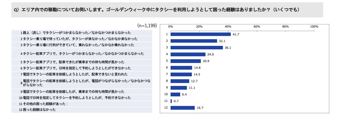 GW期間中に4都市を訪れてタクシーを利用しようとした1,199人のうち、8割以上が「困った経験をした」と回答。具体的には、「路上(流し)でタクシーがつかまらなかった/なかなか捕まらなかった」「タクシー乗り場に行列ができていて乗れなかった/なかなか乗れなかった」「タクシー乗り場で待っていたが、タクシーが来なかった/なかなか来なかった」が上位。