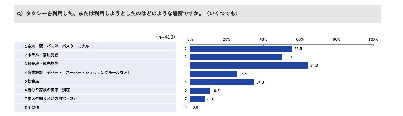 タクシーの利用ニーズが多いのは、「観光地・観光施設」「空港・駅・バス停」「ホテル・宿泊施設」。こうした拠点からの二次交通手段が不足している可能性がある。