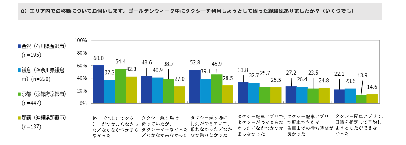 エリア別にみると、金沢訪問者と京都訪問者では約半数から最大6割の人が、タクシー乗り場や路上(流し)でタクシーがつかまらなかった・なかなかつかまらなかったと回答
