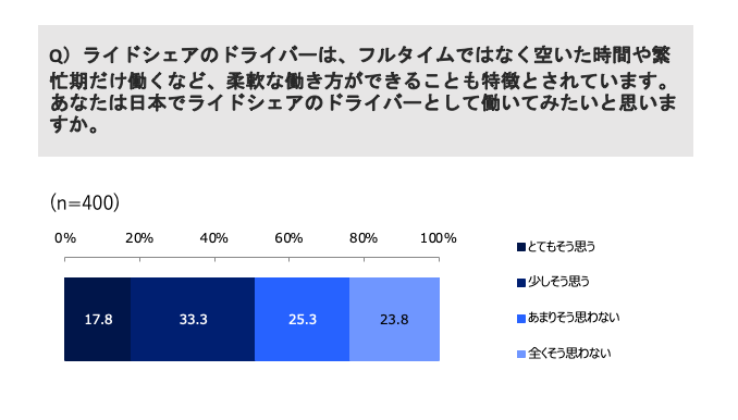 【設問】ライドシェアのドライバーは、フルタイムでなく空いた時間や繁忙期だけ働くなど、柔軟な働き方ができることも特徴とされています。あなたは日本版ライドシェアのドライバーとして働いてみたいと思いますか(n=400)