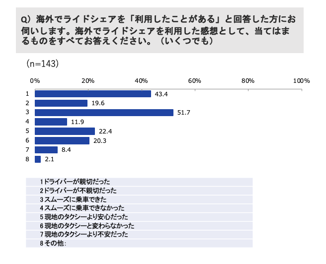 【設問】(海外でライドシェアを利用したことがある方)海外でライドシェアを利用した感想として、当てはまるものをすべてお答えください(n=143)