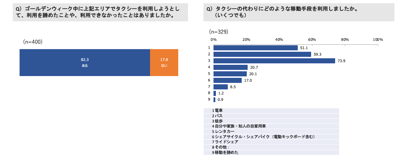 GW期間中にタクシー利用に困った人のうち82%がタクシー利用を断念したと回答。さらに、タクシー利用を諦めた人の約4分の3(73.9%) が代替の公共交通手段がなく「徒歩」で移動した経験をしている。