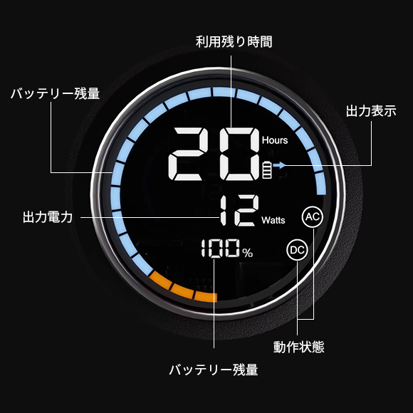 ディスプレイに残りの電力量、使用可能時間、使用中のポート、そして現在の電力など必要な情報がすべて一目でわかります。常にデバイスの電力状況を把握することができます。