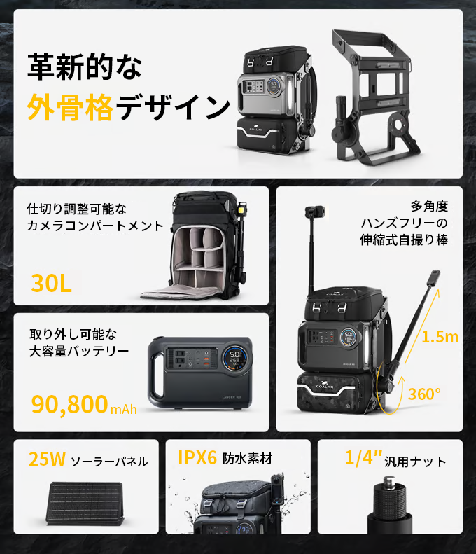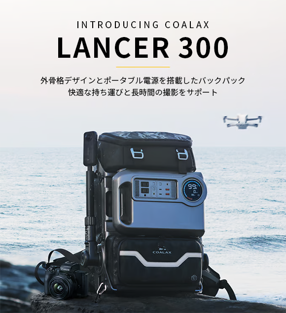 自撮り機能を搭載、ポータブル電源一体型3-in-1バックパック「LANCER 300」