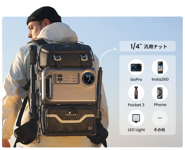 また、万が一の災害時にも頼りになります。災害時には、このポータブル電源をバックパックに取り付けることができます。そうすることで、照明や通信機器など、必要な装備を持ち運ぶことができます。さらに、バックパックの側面に装備を掛けることで、両手を自由に使うことができます。