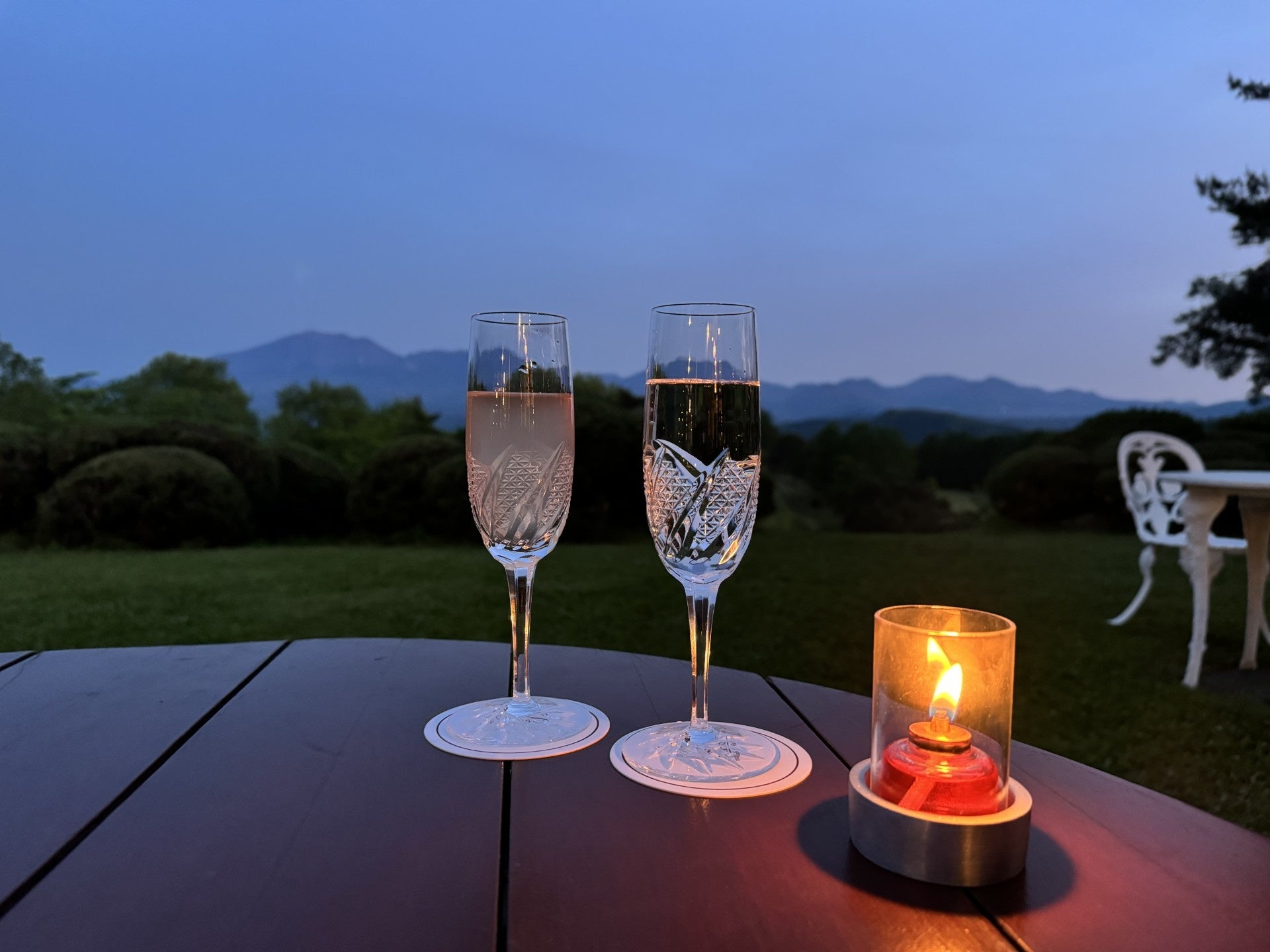 焚火を眺めながらご夕食前の大人のひとときを過ごして