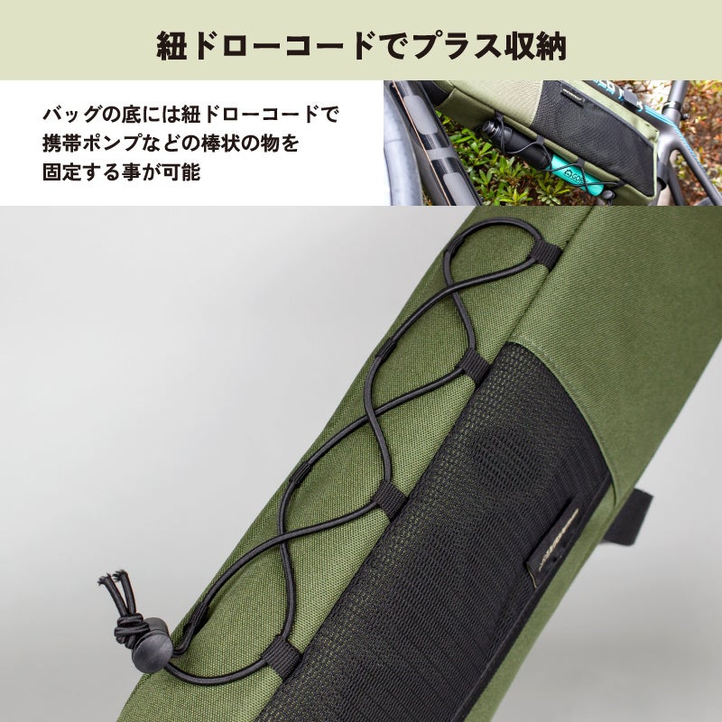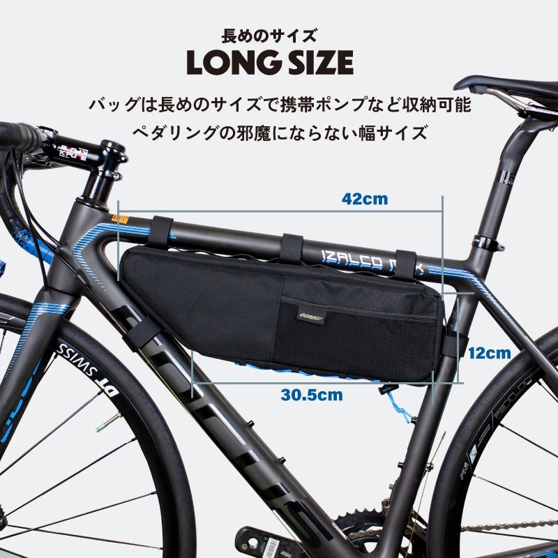 フレームバッグは長めのサイズで長い携帯ポンプなども収納可能です。