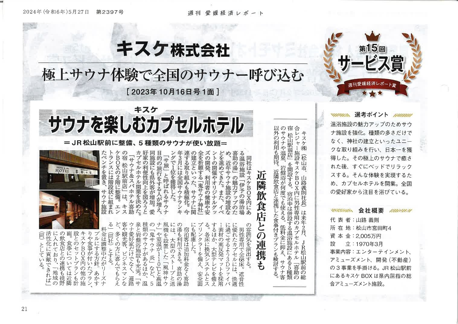 2024年5月27日 愛媛県松山市を拠点に展開するキスケ株式会社が運営する「サウナ&スパ ホテル喜助の宿 松山駅前店」が、愛媛県の著名な経済誌「週刊愛媛経済レポート」が主催する第15回週刊愛媛経済レポート賞2024において、サービス賞を受賞いたしました。